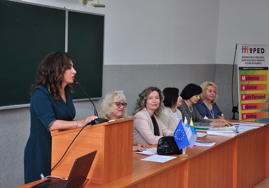 На урочистому зібранні з нагоди відкриття тренінгів виступила доктор філософських наук, професор, проректорка з науково-педагогічної роботи Галина Михайлишин, котра, як учасниця команди проекту MoPED, вказала на основних його завданнях щодо модернізації освітніх програм з підготовки вчителя для Нової української школи, акцентувала на потребі оновлення змісту освіти в університеті з використанням кращих європейських практик, підвищення якості надання освітніх послуг у руслі підготовки кваліфікованих фахівців.