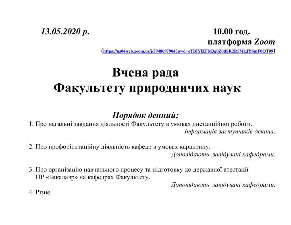 Шановні колеги! У середу, 13 травня 2020 року, о 10.00 год. на платформі Zoom відбудеться дистанційне засідання Вченої ради Факультету. Інформація для приєднання: Тема 1: Вчена рада 13 травня 2020 10:00 AM Приєднатися до конференції Zoom ? https://us04web.zoom.us/j/5948697904?pwd=eTBIYlZFM3g0Z0dSR2R5MkJYSmF0QT09 Ідентифікатар конференції: 594 869 7904 read more